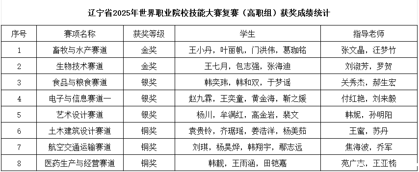 日前,辽宁省教育厅公布辽宁省2025年世界职业院校技能大赛复赛获奖名单。我院学生代表队凭借扎实的专业技能和出色的临场表现,在相关赛道中喜获金奖2项、银奖3项、铜奖3项,展现了辽农学子良好的精神风貌。